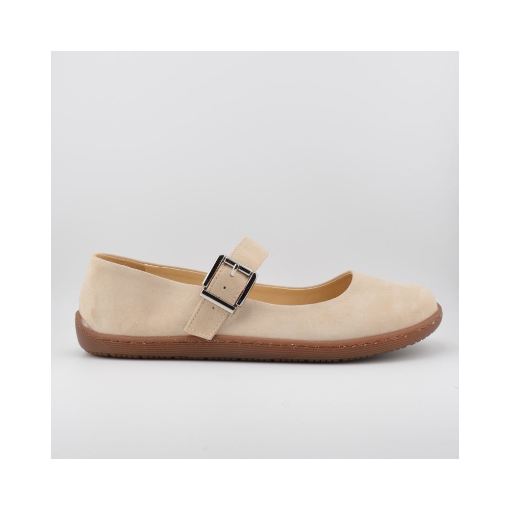 Odkryj wyjątkowy komfort i styl z naszymi beżowymi balerinami damskimi wykonanymi z wysokiej jakości zamszu. Klasyczny fason z zaokrąglonym noskiem został urozmaicony szerokim paskiem z elegancką, metalową klamrą, która nie tylko stanowi modny akcent, ale także zapewnia idealne dopasowanie do stopy. Elastyczna, brązowa podeszwa gwarantuje wygodę podczas codziennego użytkowania, a subtelny kolor sprawia, że buty doskonale komponują się z wieloma stylizacjami – zarówno casualowymi, jak i bardziej eleganckimi. To idealny wybór dla kobiet ceniących sobie połączenie komfortu, minimalizmu i uniwersalnego designu.