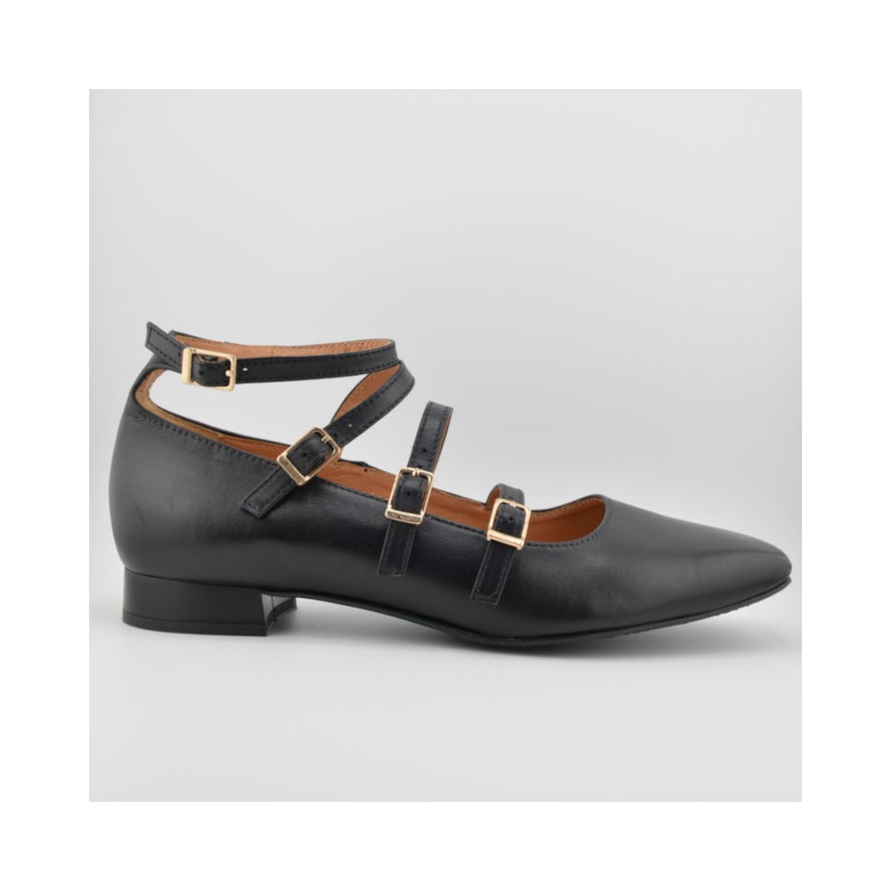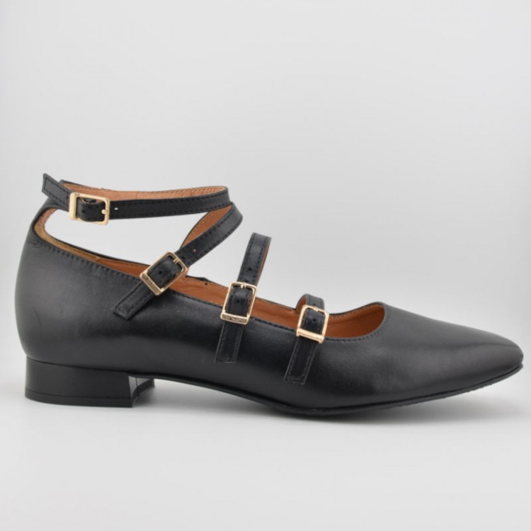 Czarne baleriny na niskim obcasie to idealne połączenie elegancji i komfortu. Model wyróżnia się oryginalnym designem z czterema dekoracyjnymi paskami zakończonymi złotymi klamrami, które oplatają stopę i kostkę, tworząc wyrazisty, modny akcent.
